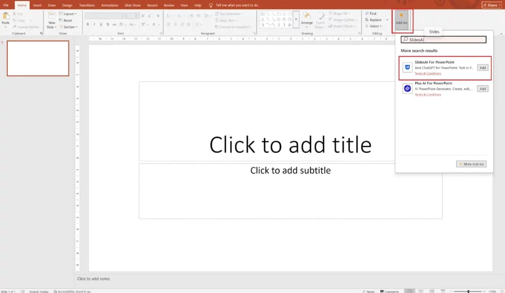 Go to Home → Add-ins → Search for “SlidesAI”, then click Add to install it.