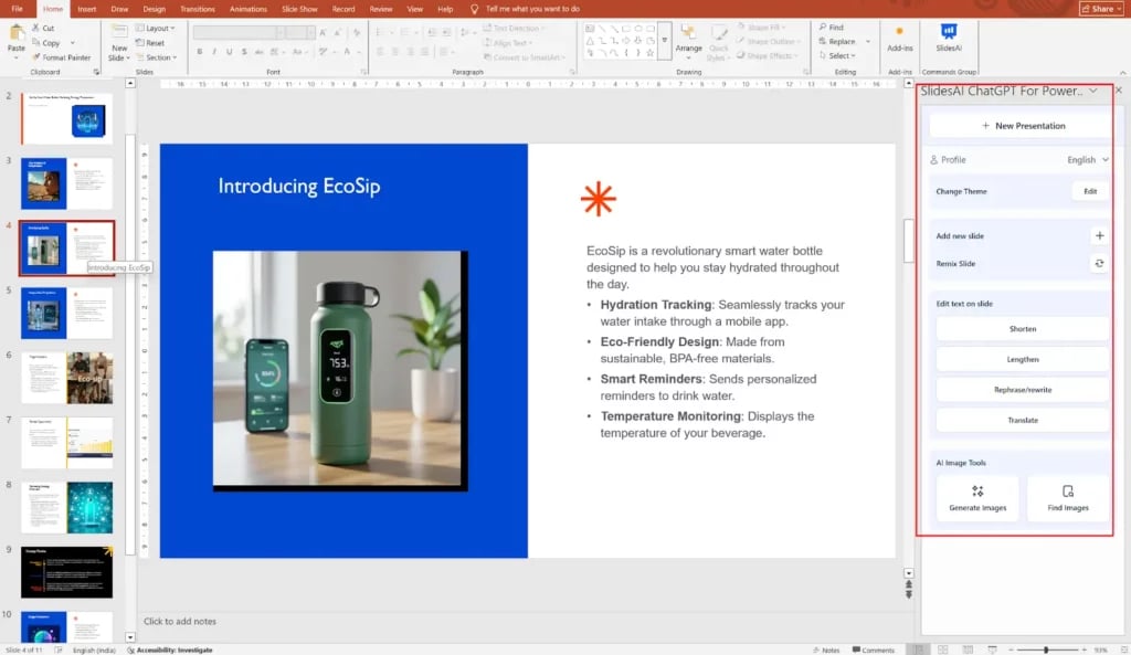 Step 9: Your presentation will be created based on your inputs. You can then further edit, refine, or customize the slides to match your brand and messaging.