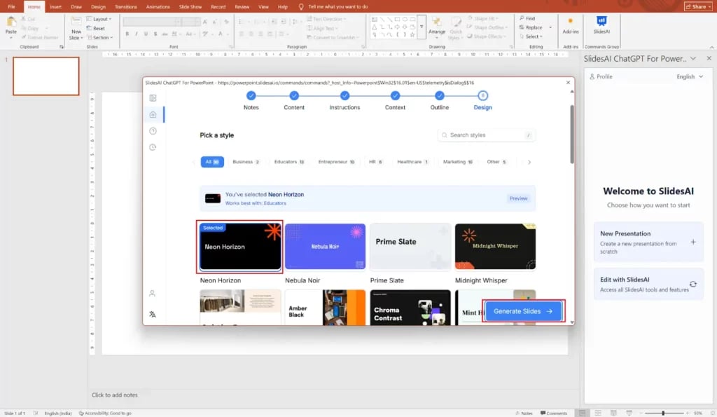 Step 8: Pick a slide design template from the available options and click Generate Slides.