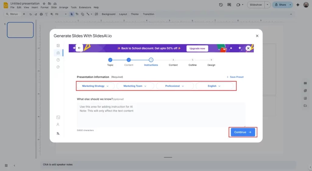 Step 5: Specify your preferences, such as tone, style, and key focus areas, to help SlidesAI understand your presentation goals.