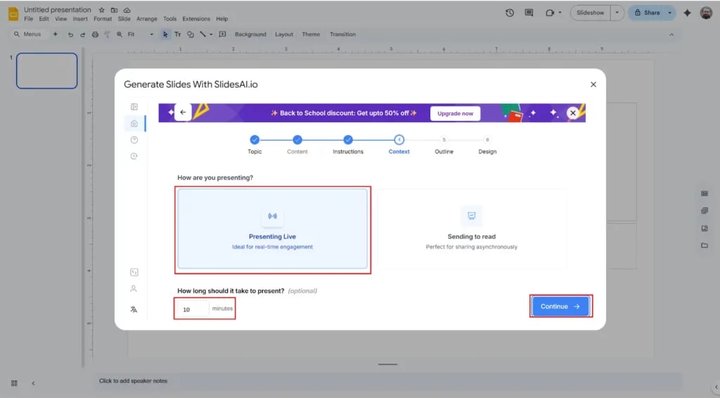 Let SlidesAI know whether this is for a live pitch, webinar, or report, and indicate how long you plan to present.