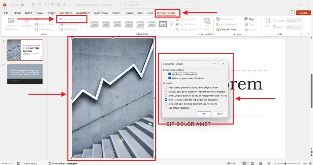 Pictures are often the main reason a PowerPoint file gets too big. Compressing images helps lower the file size by reducing the resolution and removing parts of pictures you don’t need, without making your slides look bad.