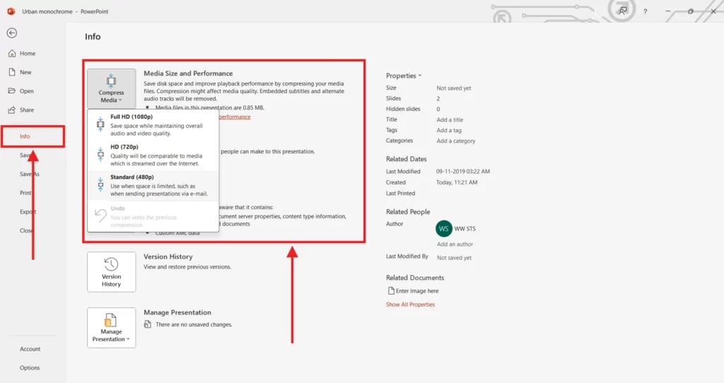Go to File > Info > Compress Media to see if videos are using lots of space. You can also look for large images, embedded fonts, or unused slides and remove what you don’t need. AI tools can make this faster by helping clean up the file for you.