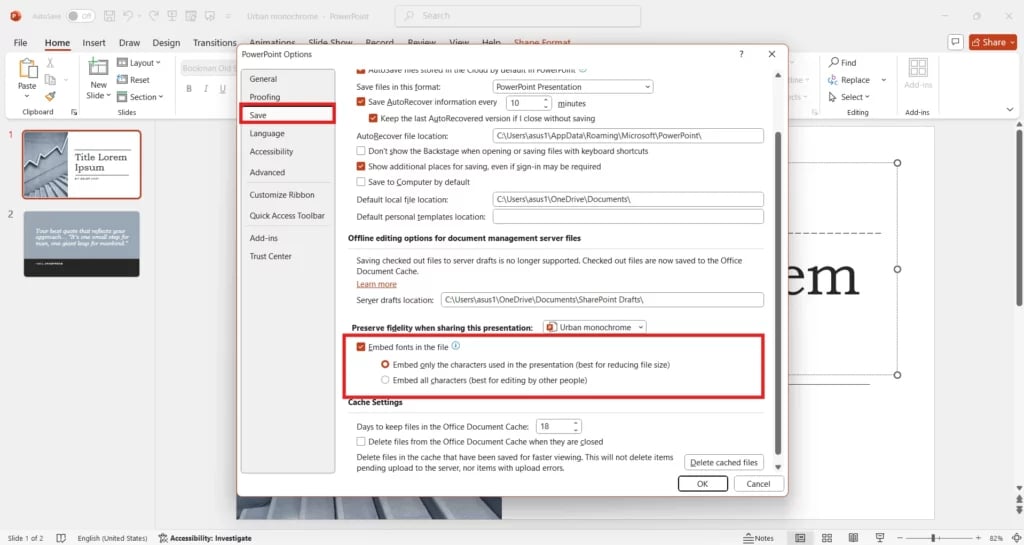 - Under “Preserve fidelity when sharing this presentation”, uncheck “Embed fonts in the file.”