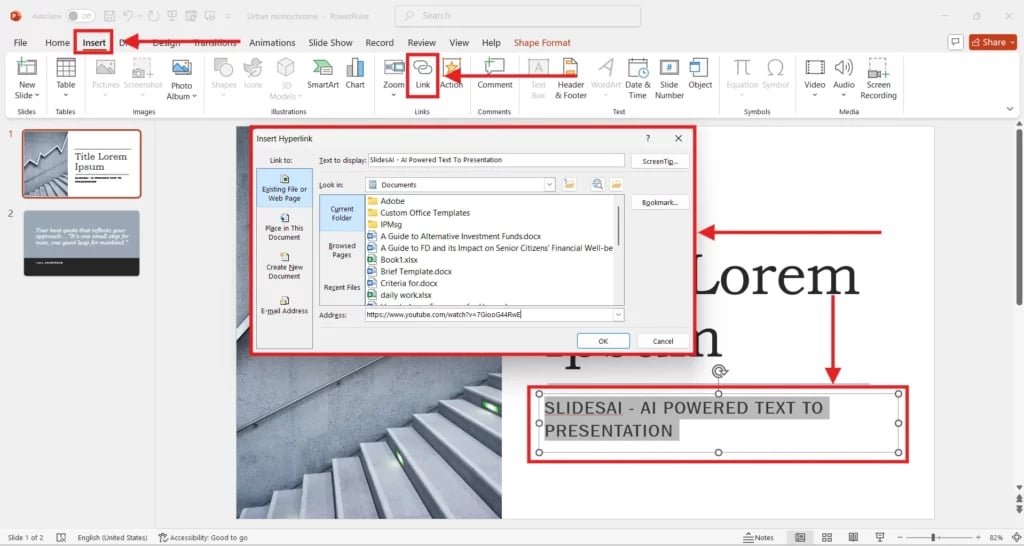 - Go to Insert > Link > Insert Link or Insert > Text > Hyperlink.