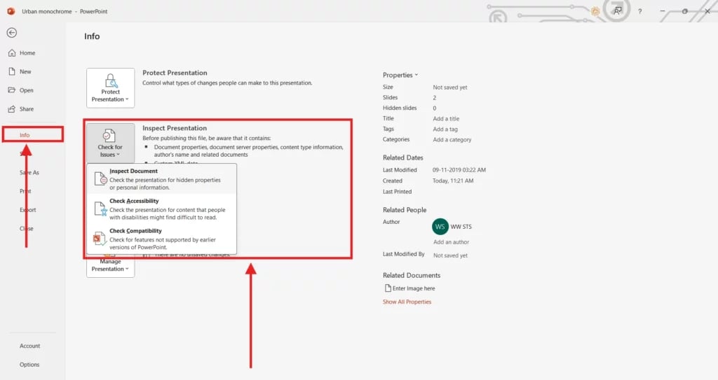 - Go to File > Info > Check for Issues > Inspect Document to remove speaker notes.