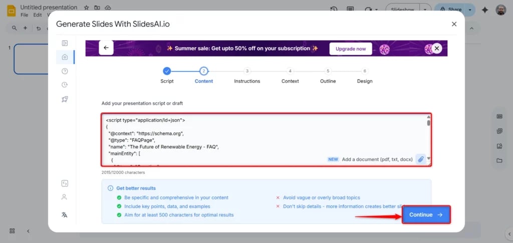 - After adding your script, click Continue to generate the slides.