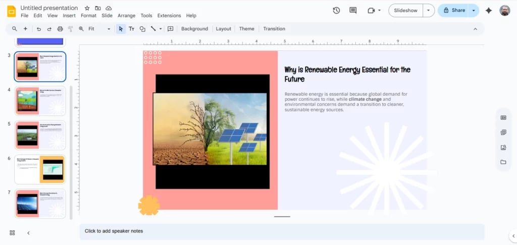 Once SlidesAI generates your full presentation, it’s time to refine and personalise it. You can: